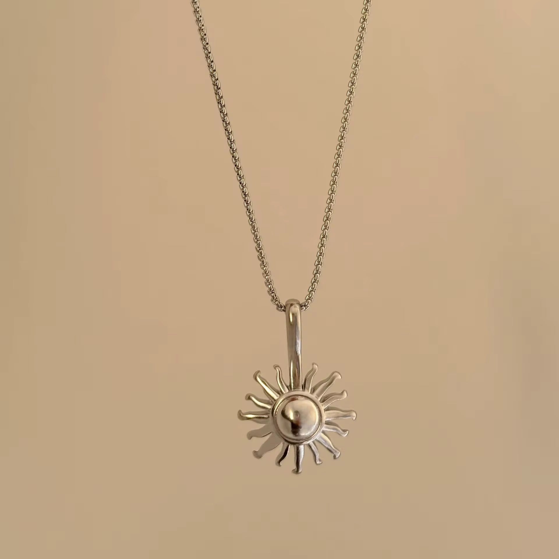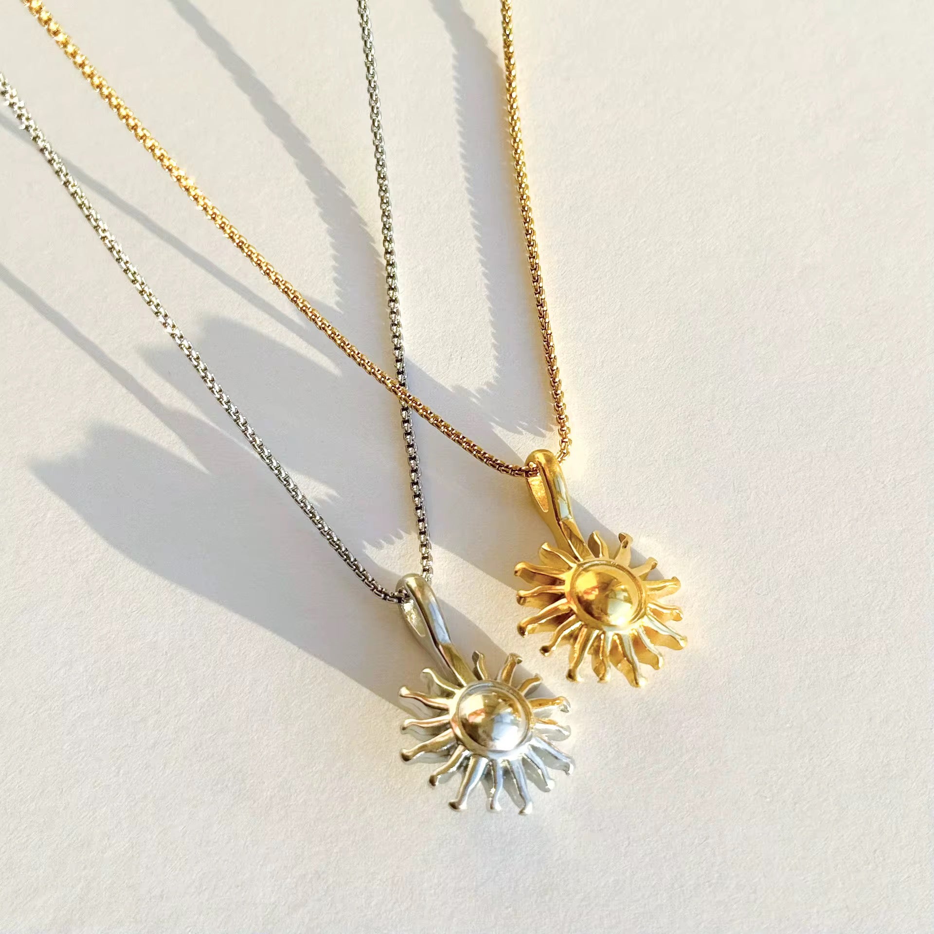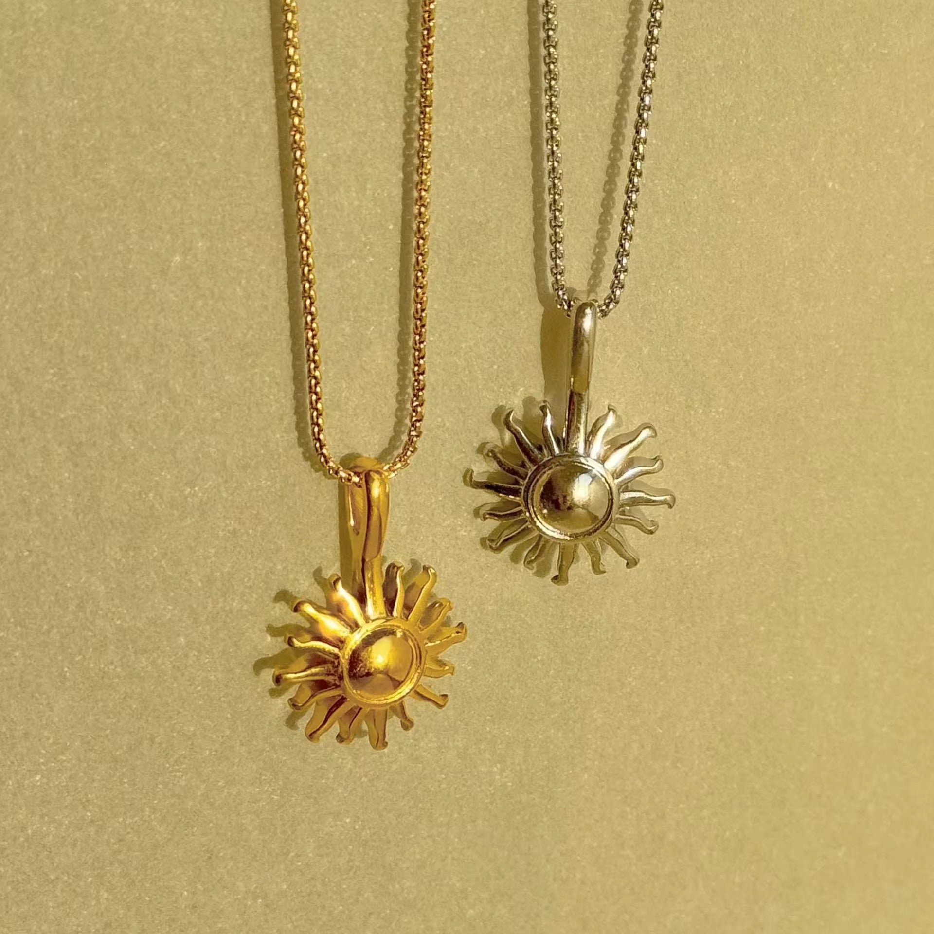 This stunning sunburst pendant is crafted from durable stainless steel, offering a radiant look that lasts. Available in both gold and silver finishes, its intricate rays frame a smooth, polished center, capturing the essence of light and energy. Hypoallergenic, tarnish-resistant, and perfect for everyday wear, it’s a timeless piece that layers beautifully or stands out on its own.